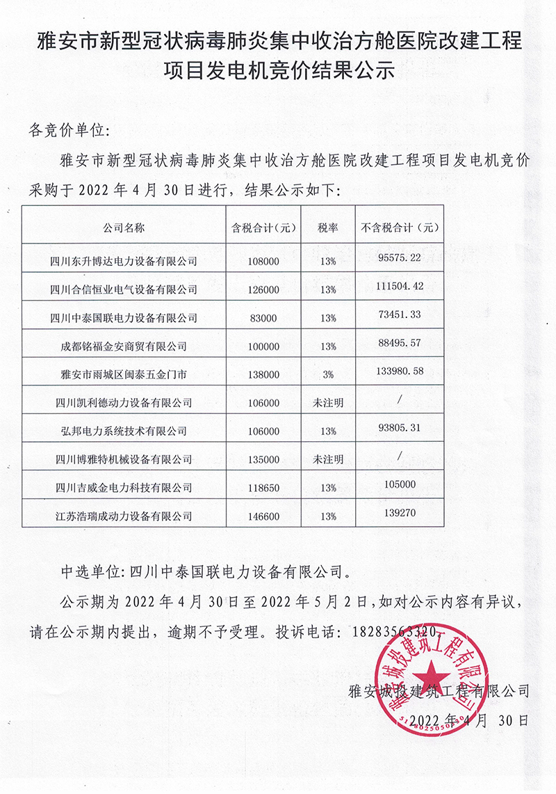 雅安市新型冠狀病毒肺炎集中收治方艙醫(yī)院改建工程項(xiàng)目發(fā)電機(jī)競價(jià)結(jié)果公示