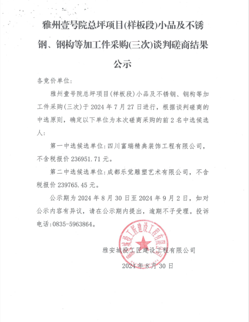 雅州壹號(hào)院總坪項(xiàng)目(樣板段)小品及不銹鋼、鋼構(gòu)等加工件采購(三次)談判磋商結(jié)果公示