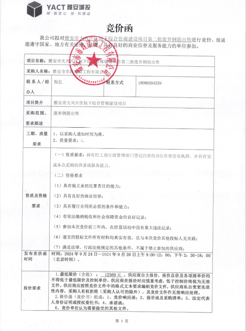 雅安市大興片區(qū)地下綜合管廊建設(shè)項目第二批廢棄鋼筋出售競價公告