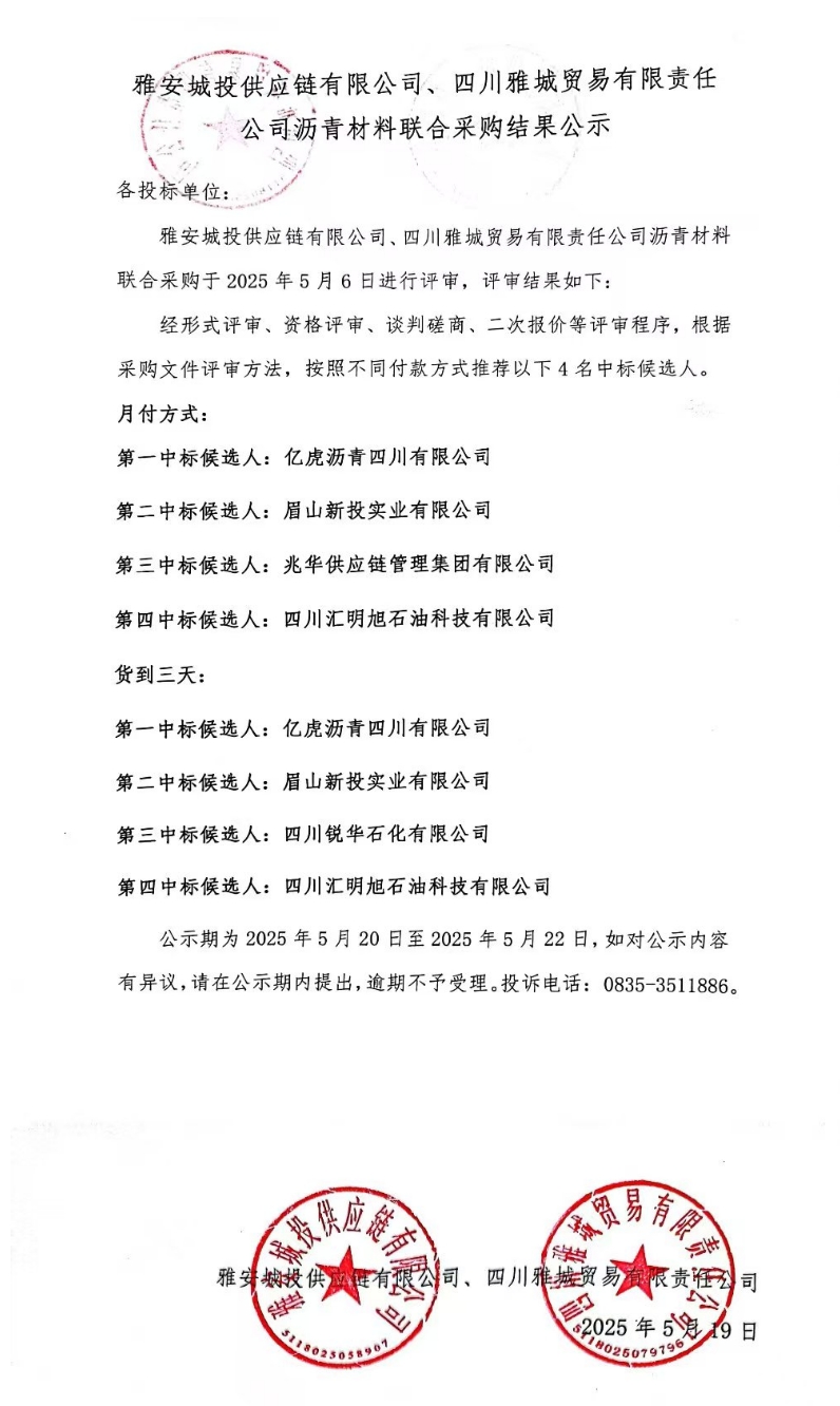 雅安城投供應(yīng)鏈有限公司、四川雅城貿(mào)易有限責(zé)任公司瀝青材料聯(lián)合采購(gòu)結(jié)果公示